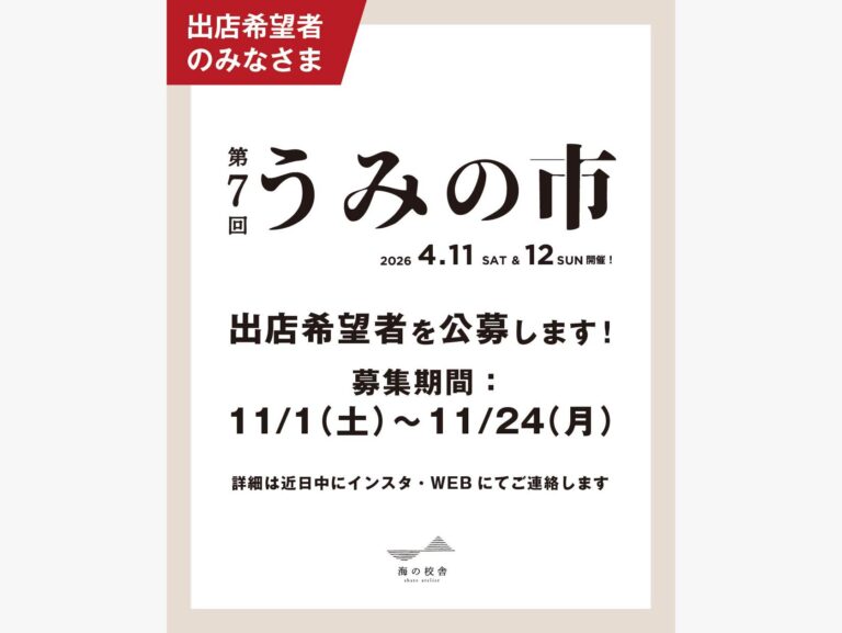 googleアカウントを利用できない方への情報を最下部に追記しました(2025.11.9) 第7回うみの市の公募を開始し … 続きを読む 第7回うみの市 公募開始 要項・申請フォームはこちら